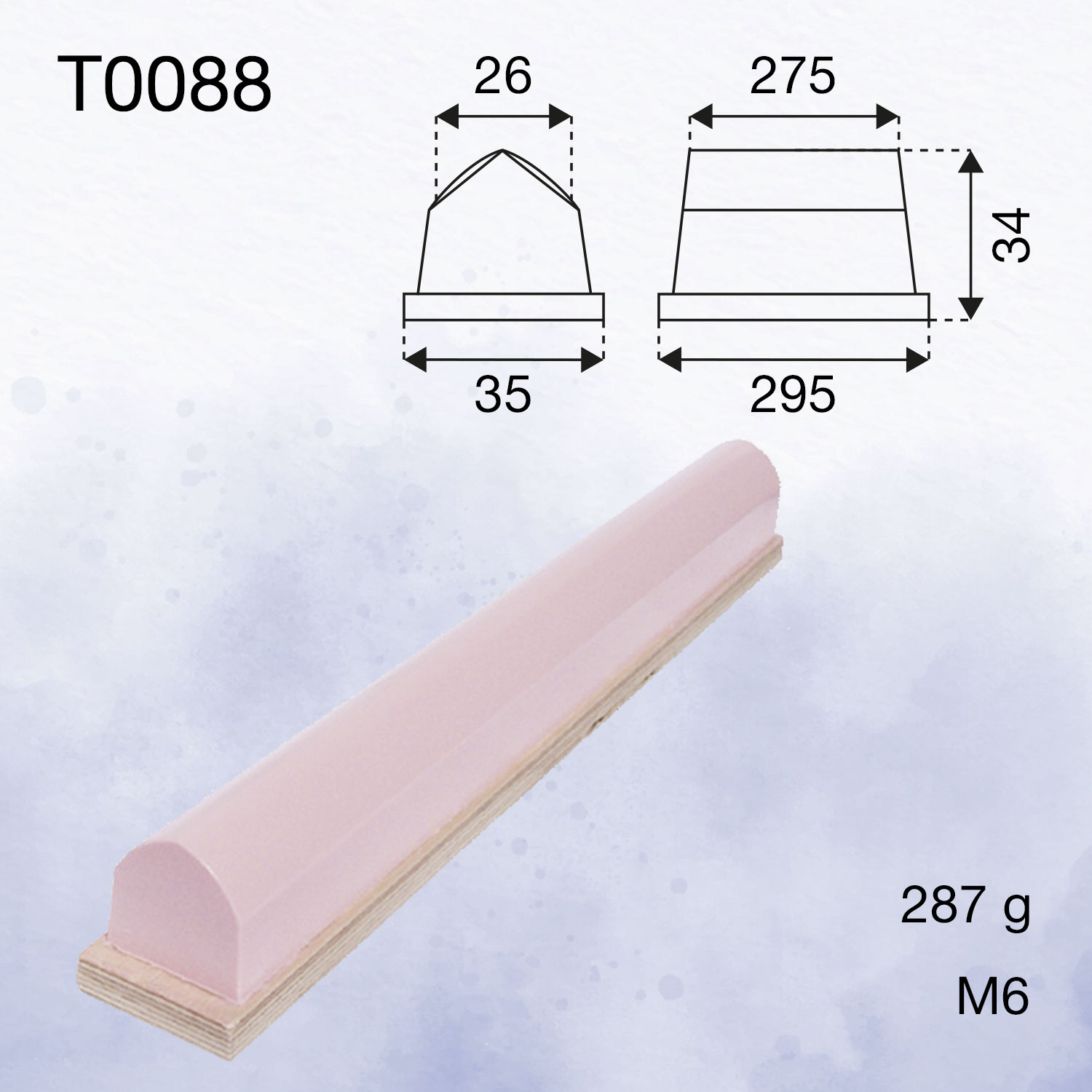Standard roof-shaped printing pads are ideal for printing flat surfaces with scales or long lines of text. It is possible to produce pads in this shape in longer lengths. Due to the apex in the centre of the pad, it is important wherever possible to pick up the image on either side of the centre line to achieve the best print quality. Rectangular printing pads in this category are also available asymmetrically or with only one half of the roof profile.
