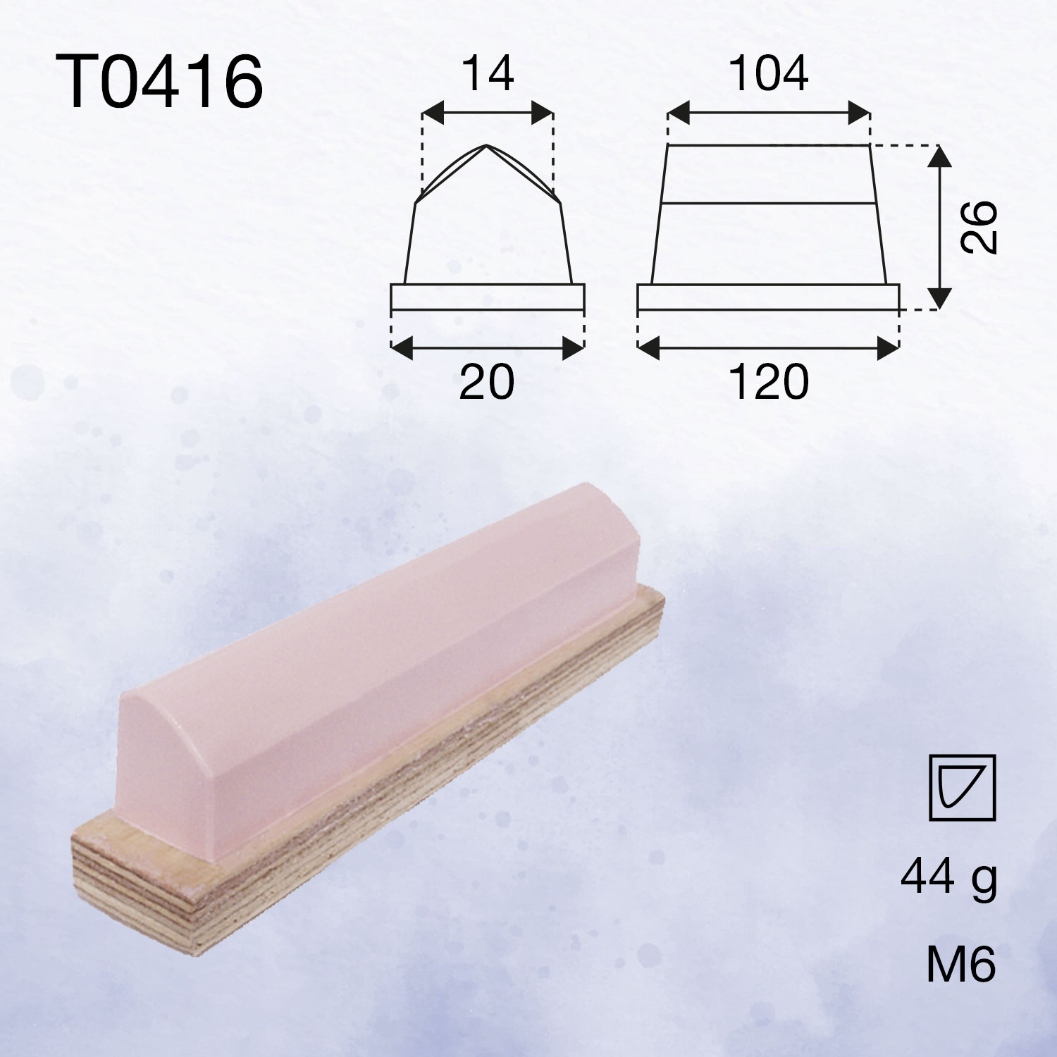 Standard roof-shaped printing pads are ideal for printing flat surfaces with scales or long lines of text. It is possible to produce pads in this shape in longer lengths. Due to the apex in the centre of the pad, it is important wherever possible to pick up the image on either side of the centre line to achieve the best print quality. Rectangular printing pads in this category are also available asymmetrically or with only one half of the roof profile.